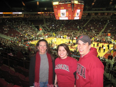 Last Saturday, Brendan and I went on a double date. We went out and battled the "icy roads" in the name of basketball! Which was a lot of fun. Luckily, the roads weren't bad! It was actually my first basketball game for Carolina. It was a great game! We played Georgia and it was super close. Luckily we came out with a Win! Go Gamecocks! I think the final score was 78-77. I'm not a big fan of basketball but I can definitely get into it when I'm at the actual game.I'm sure you can guess who was taking the picture. So Mom T. took a pic of the boys chatting/cheering.